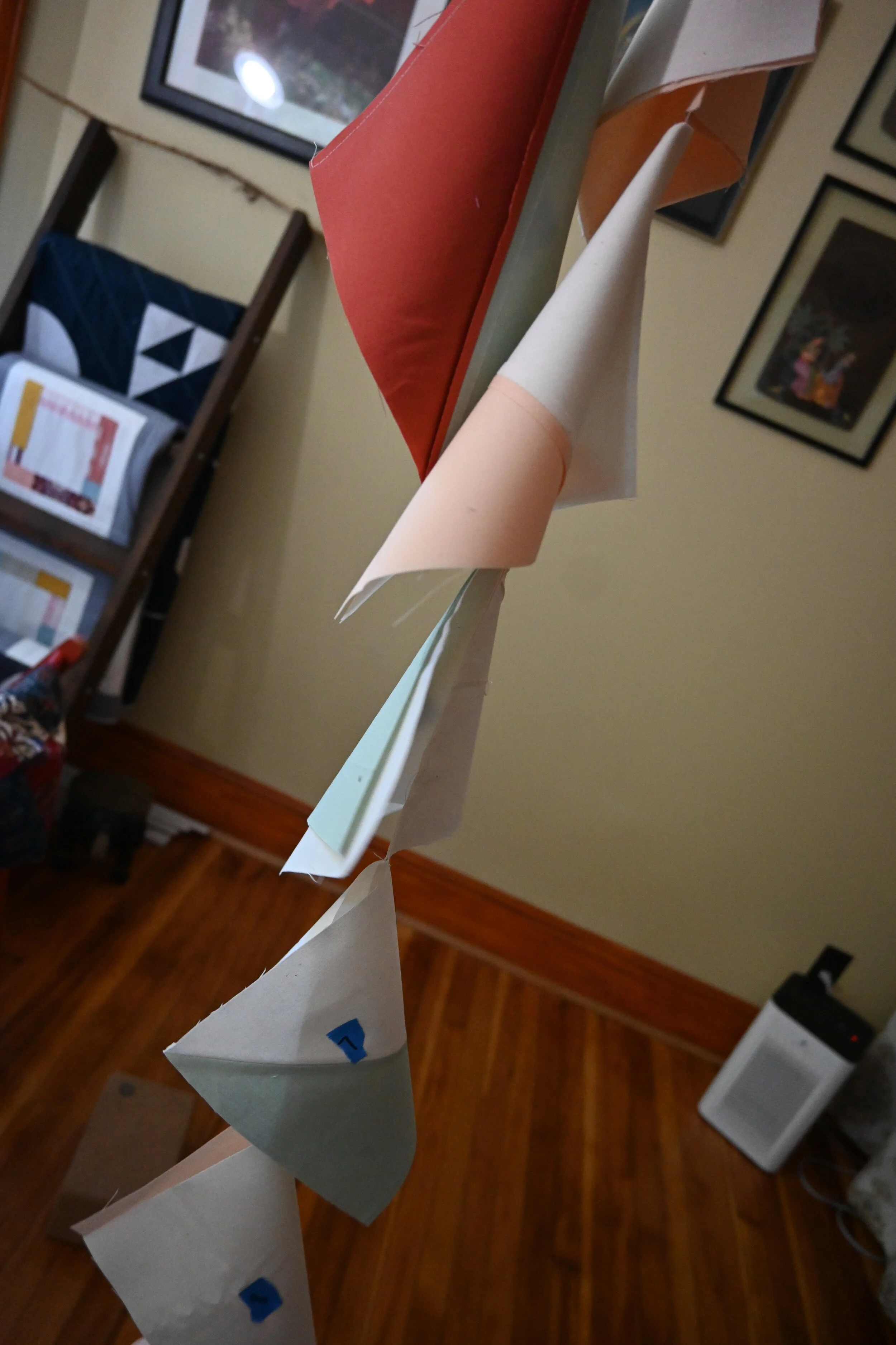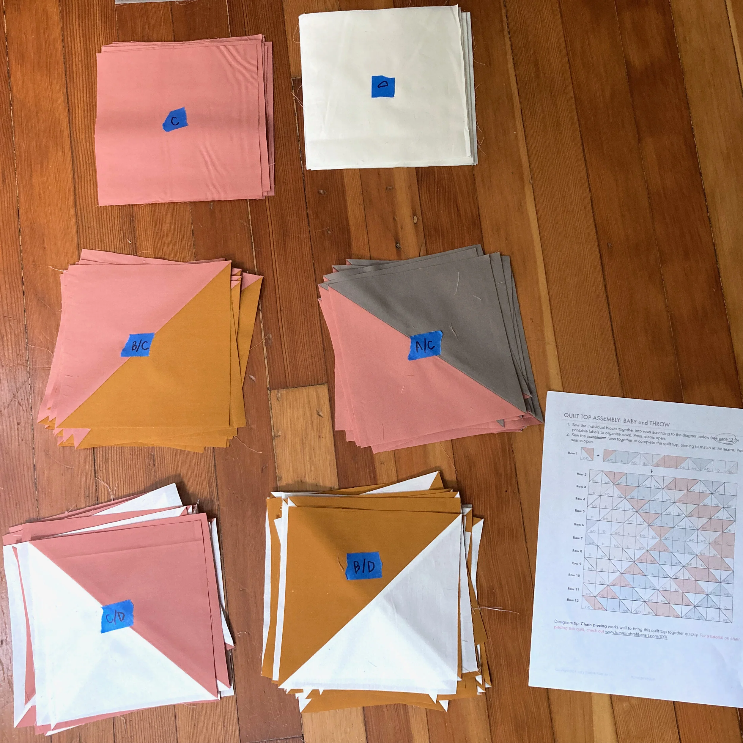 Organize your stacks near your sewing table arranged in order. Add a second label next to each stack indicating the row.