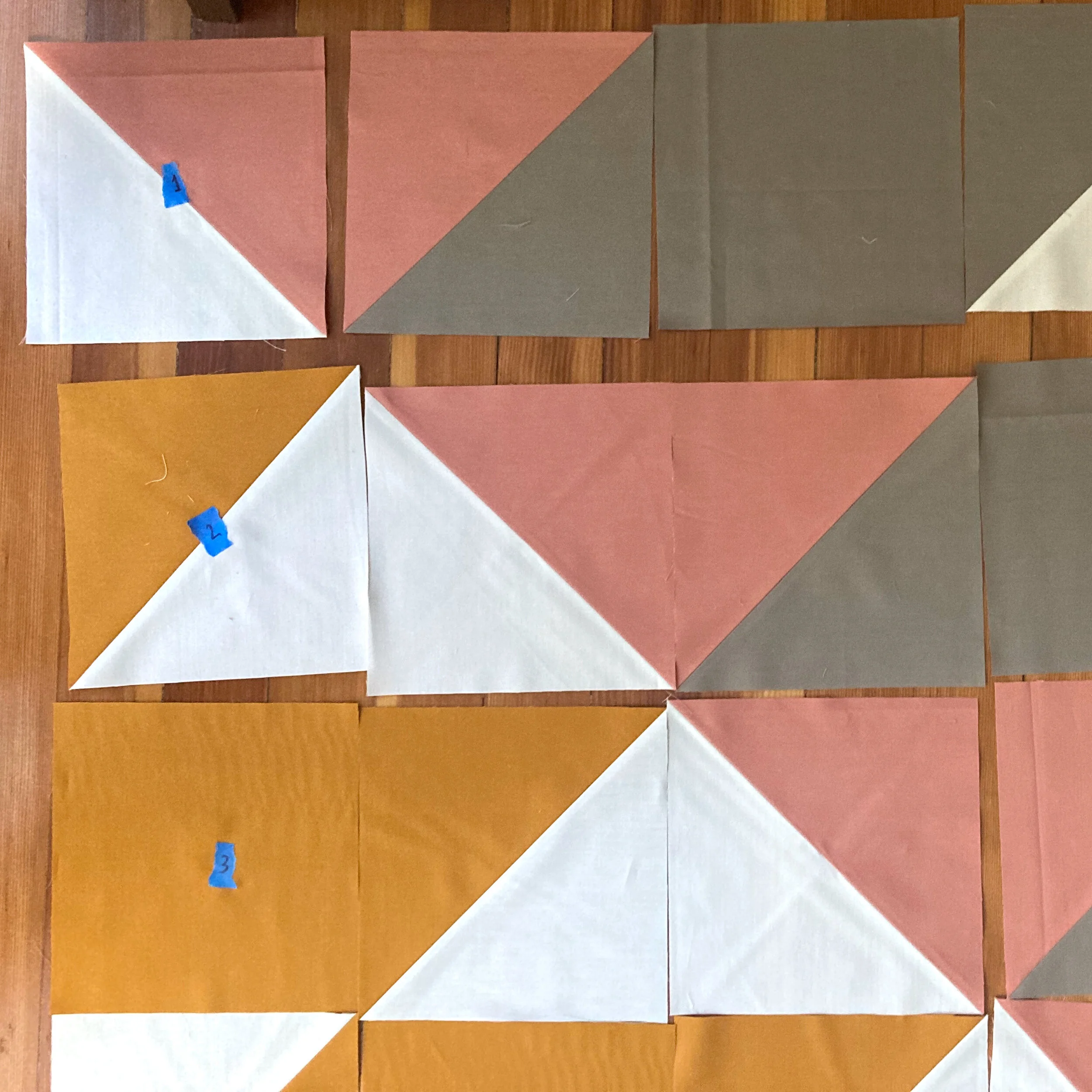 You’ll need to clear some floor space for this one! Arrange the blocks according to the Quilt Assembly page layout. Place a label on left-most block to mark each row (1, 2, 3, etc…). I like to use blue painters tape for labels as it doesn’t leave any residue on the fabric.