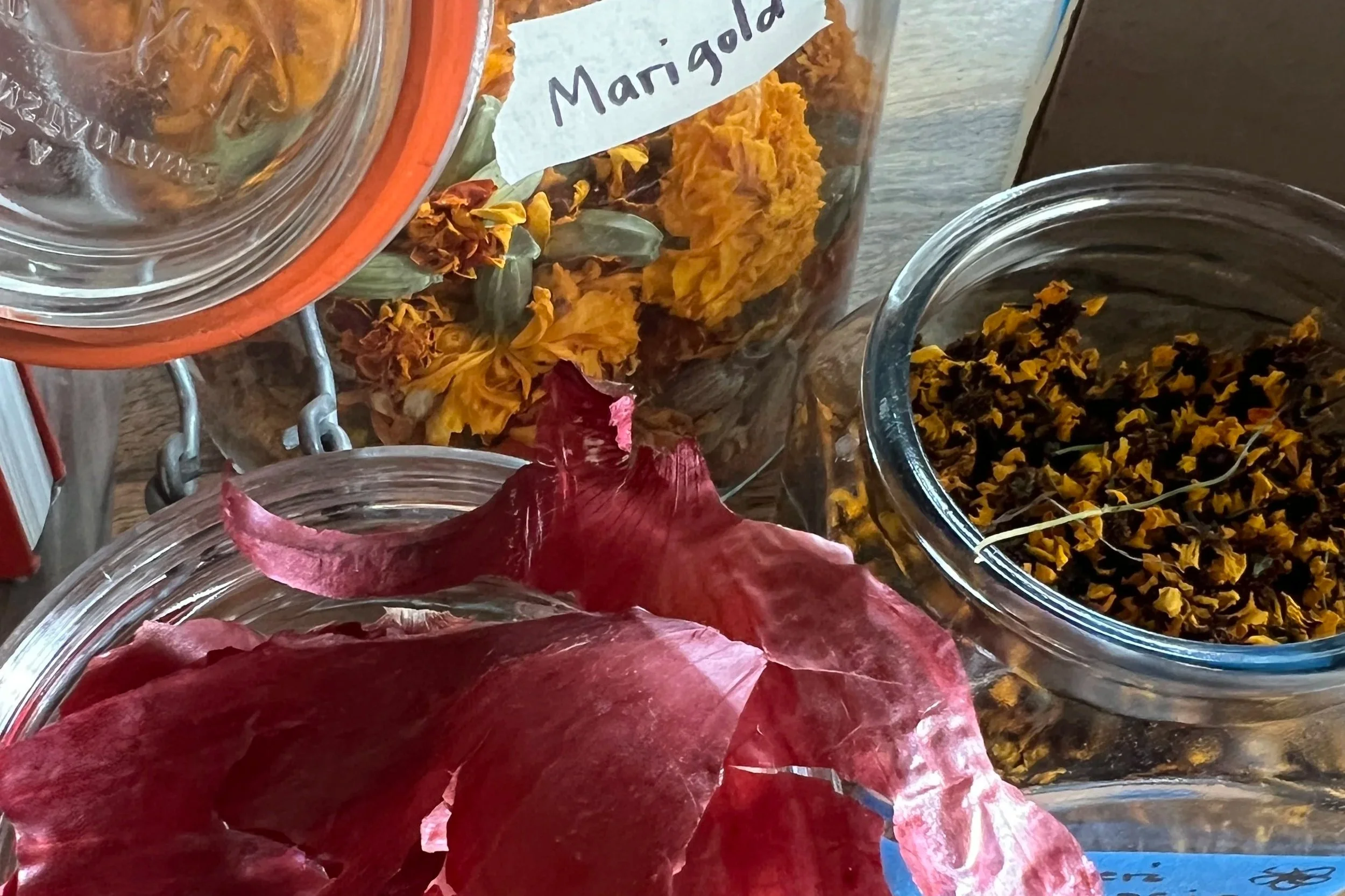 Whole material: You extract color from whole materials, such as fresh or dried flowers. Whole materials are great because these are things you can grow in your garden or gather from your community! These can be used fresh or dried and stored for later use. Color will first need to be extracted from the dyestuff before immersing the fabric. (More about this in the next post!)