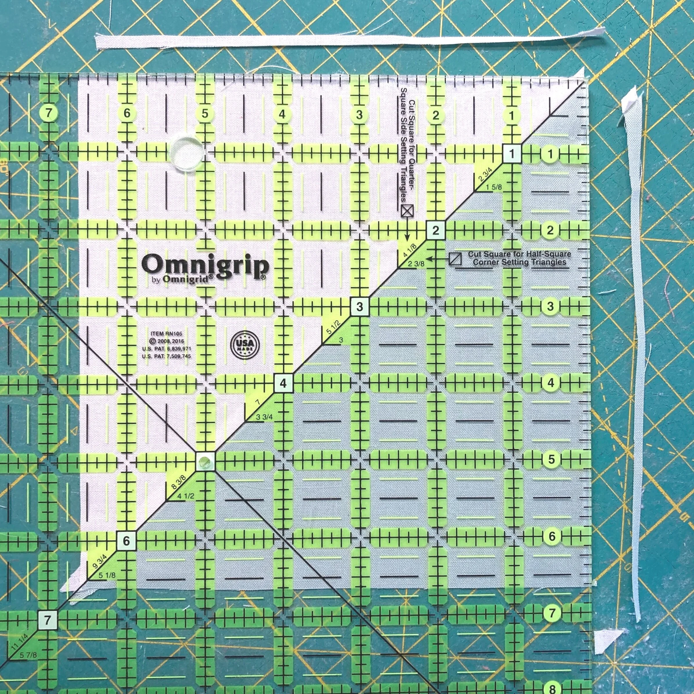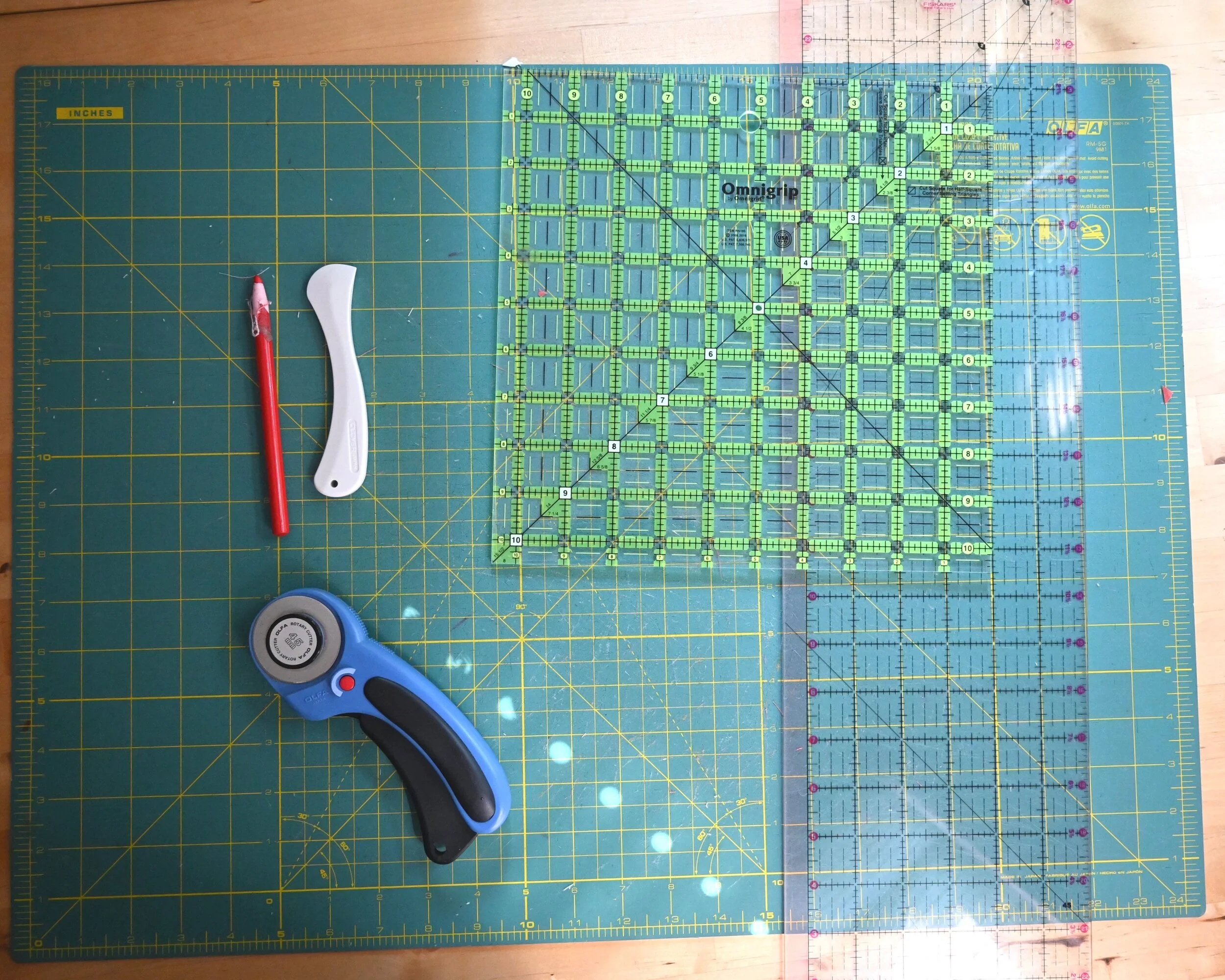Square acrylic ruler (I generally use a 6” or 10.5” square depending on the size block)