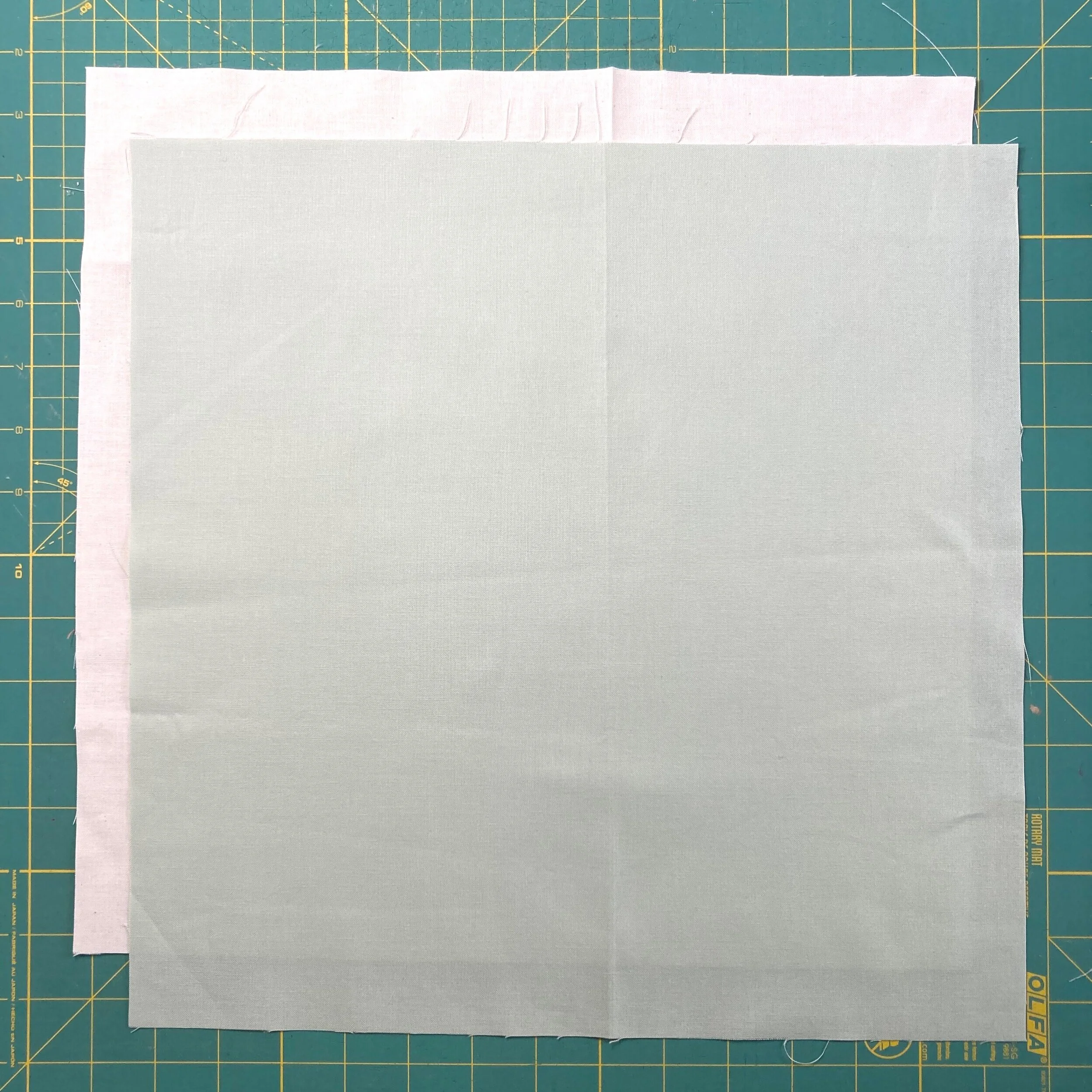 Cut two squares of fabric, one of each color. Place one on top of the other, right sides together.