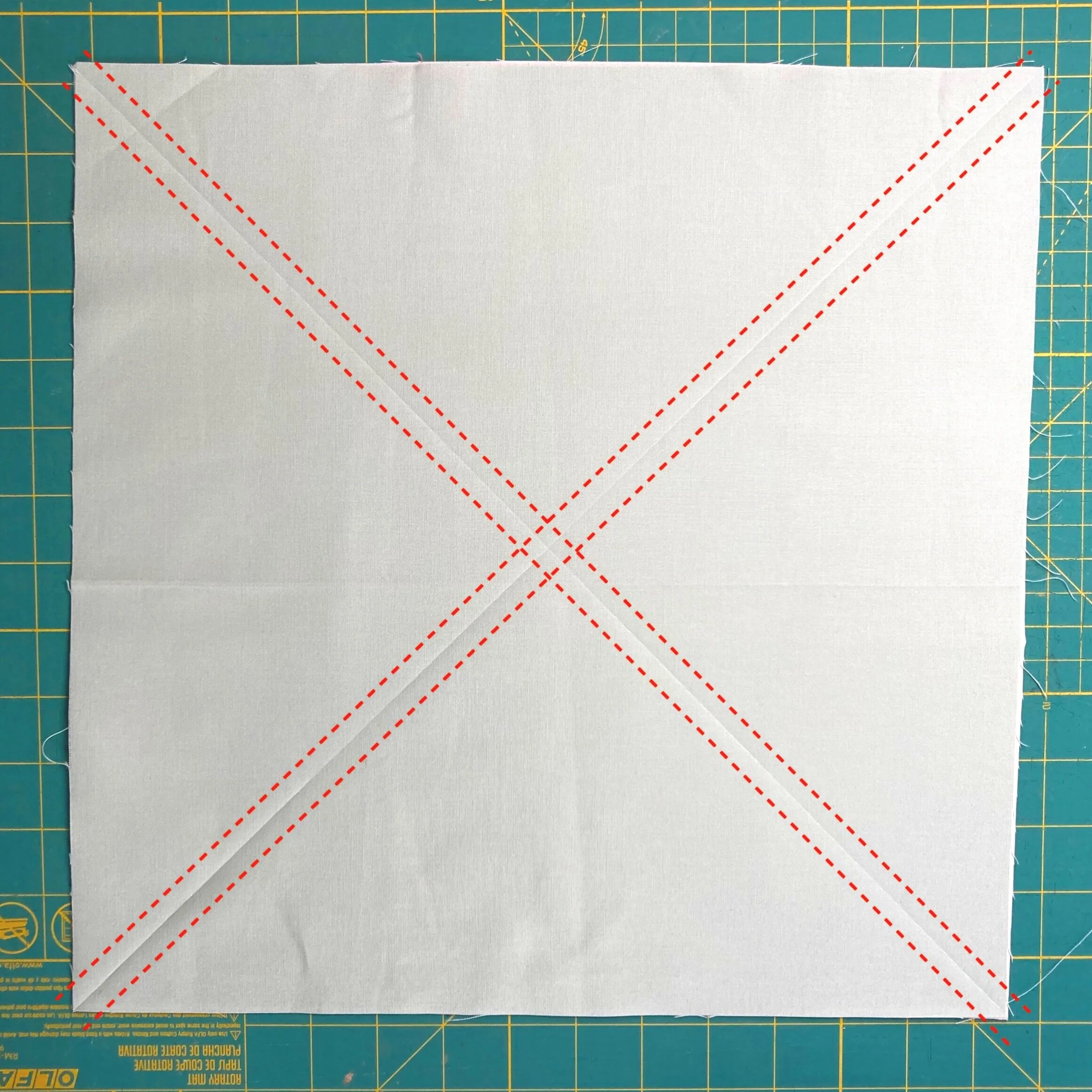 Set your machine to a 1.8-2.0mm stitch length. Sew a line of stitching 1/4” from each side of both diagonal lines, shown as red dashed lines in the photo to the left.