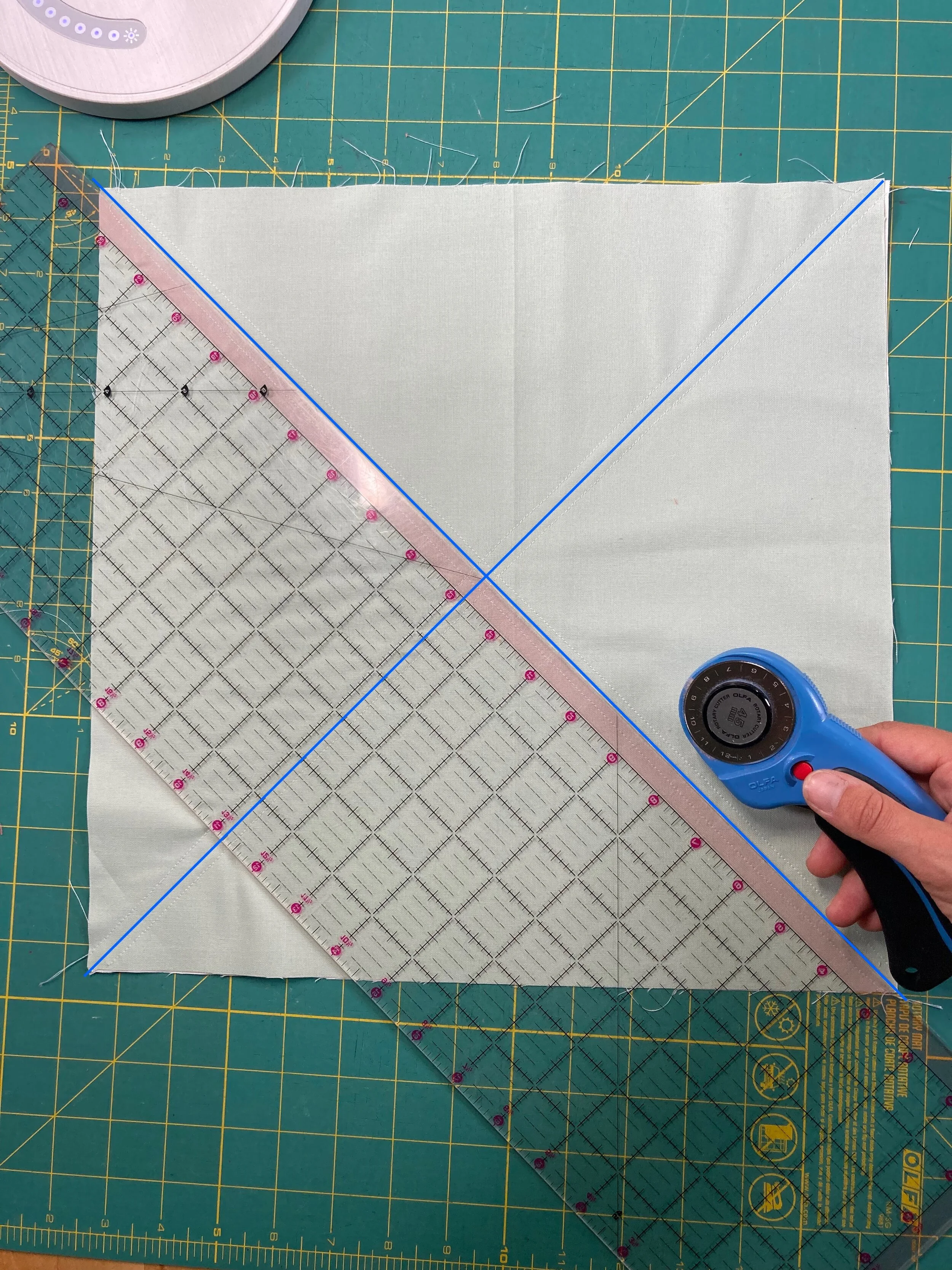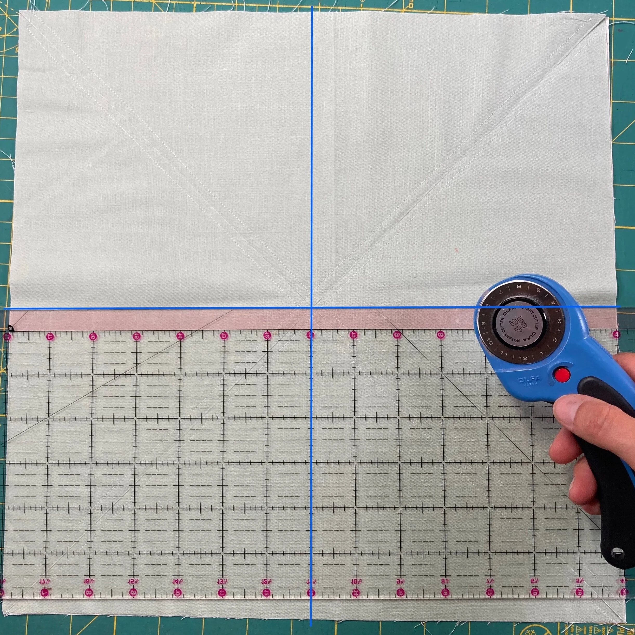 Using a ruler and a rotary cutter, cut a horizontal and a vertical line, shown as blue solid lines in the photo to the left. Make sure the cut lines intersect the center of the X.