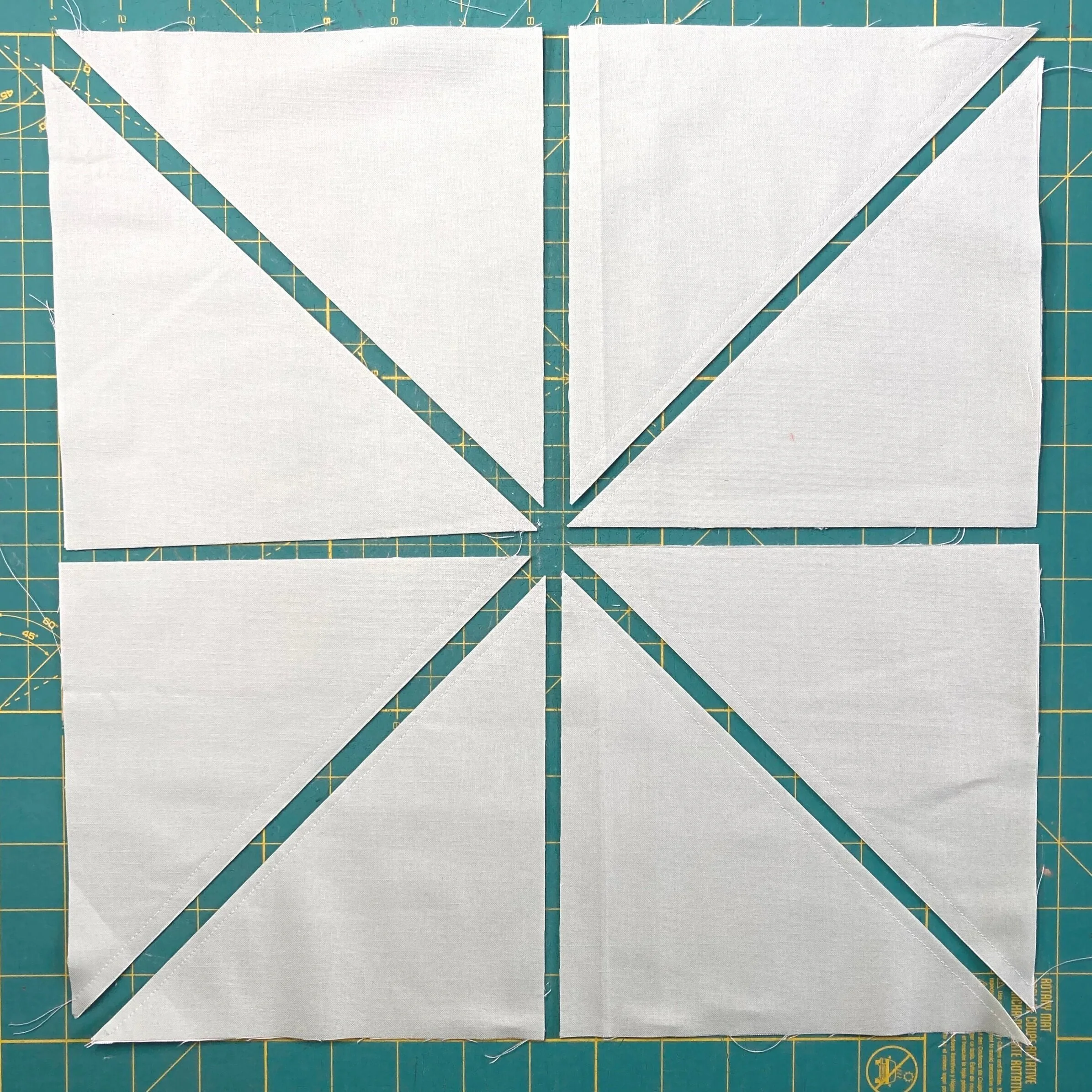 Trimming blocks accurately is the key to successful HSTs! It is important to use the seam as the guide to squaring up your blocks rather than the edges.