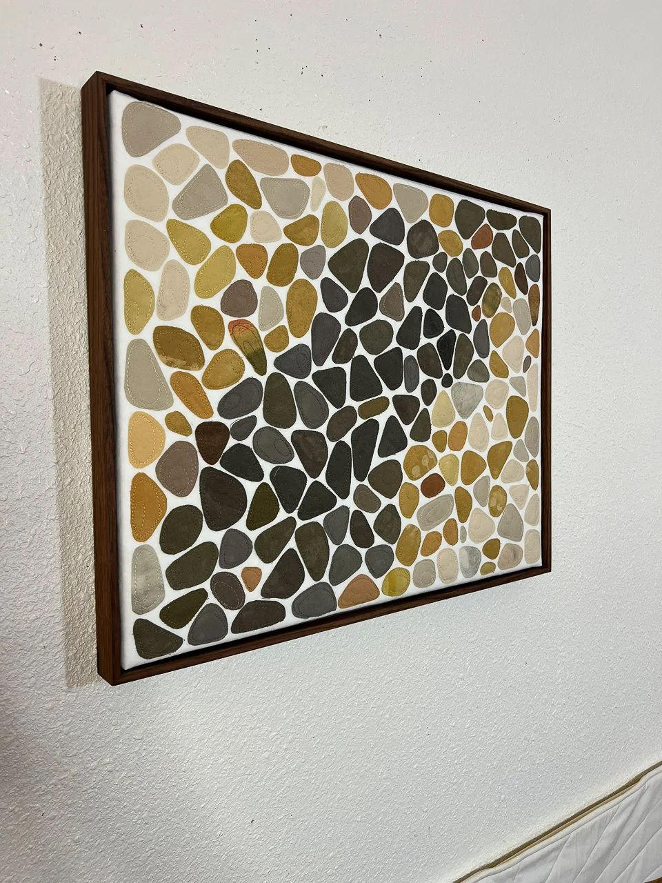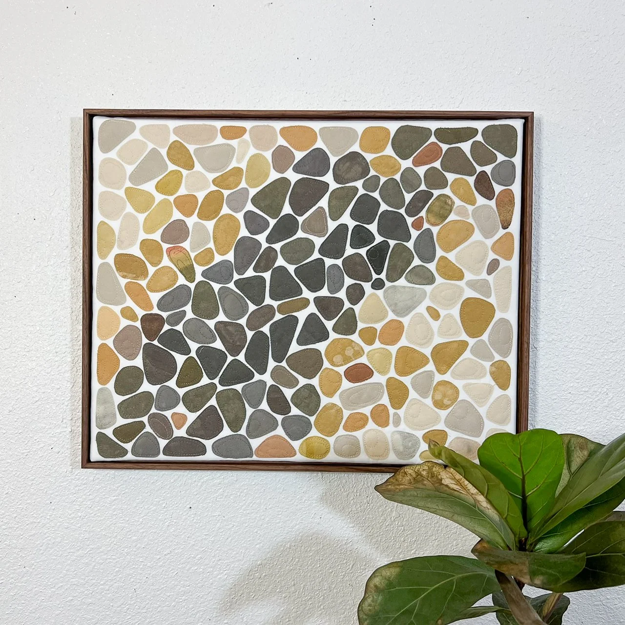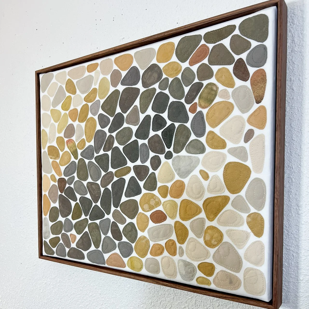This unique piece of wall art is made from leftover naturally dyed scraps of cotton fabric, supporting my commitment to a zero waste art practice. The stones are hand cut, intuitively arranged, and sewn to the background with multiple rounds of stitching for a raw edge appliqué finish.